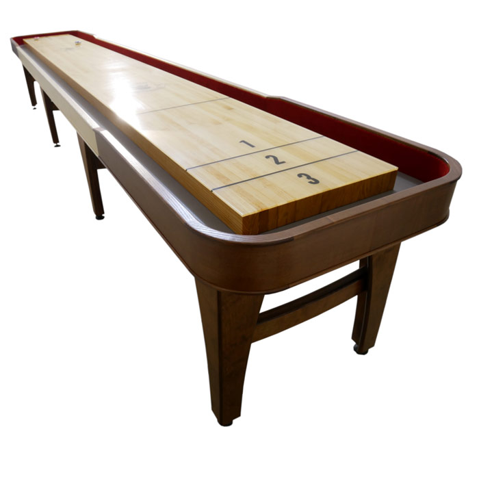 This shuffleboard table comes with accessories including eight pucks and shuffleboard wax. The table is made of molded plywood with real wood veneer and solid wood glues. The wood finishing and length can be selected by the customer. The table pictured is equivalent to 16 feet in length. Custom Logos can be digitally printed into the surface upon request.